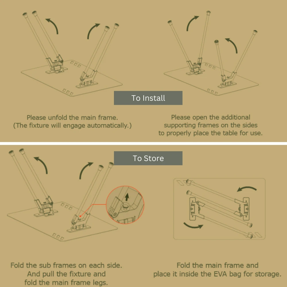 The support connected to the main body is also specially made of aluminum alloy and designed through more sturdy and stable angles. It is fast and convenient to install and withdraw since manufactured all-in-one. With a storage bag made of EVA materials, it can safely protect the table from external impact. With the bag, the table easily to carry and to store.