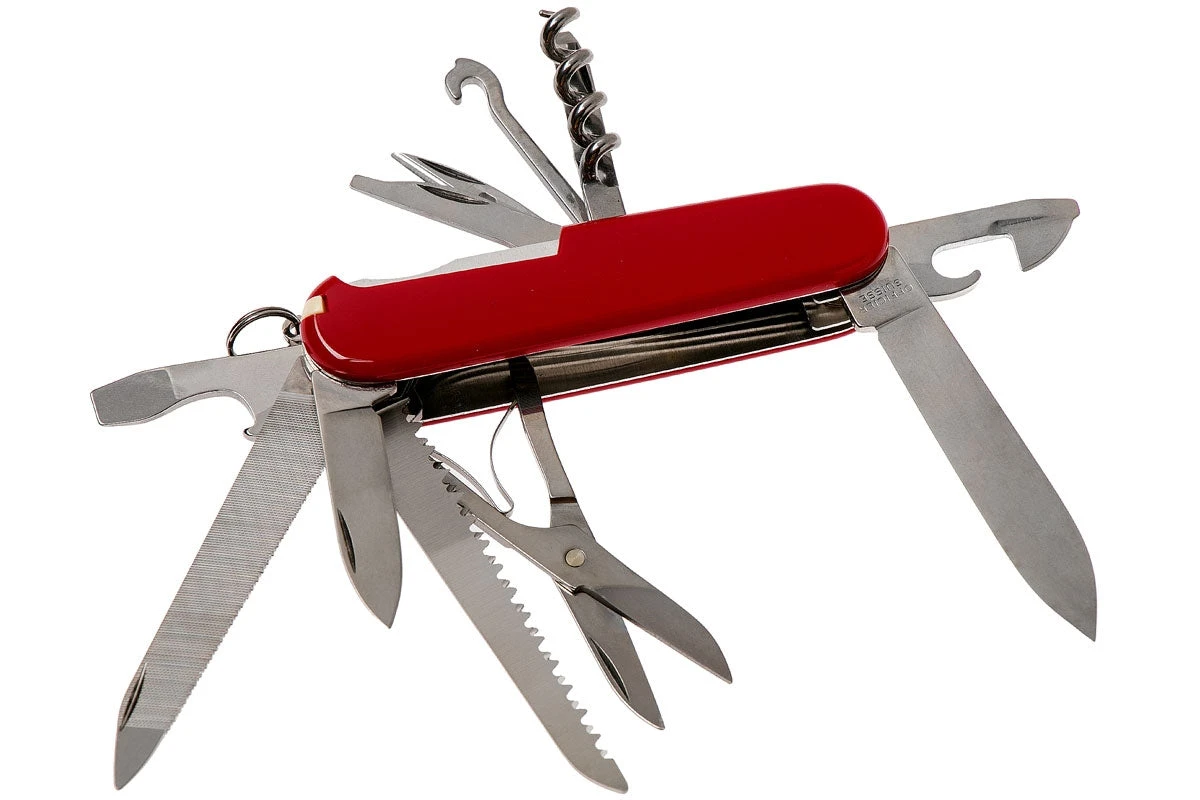 - Tools: Blade, large, Blade, small, Can Opener, Screwdriver 3mm, Bottle Opener, Wire Stripper, Screwdriver 5mm, Ramer, punch and sewing awl, Corkscrew, Scissors, Wood Saw, Nail File, Metal Saw, Metal File, Nail Cleaner, Screwdriver 2mm, Chisel 4mm, Multi Purpose Hook, Toothpick, Tweezers, Key Ring